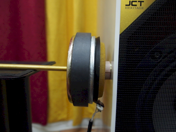 Pour cela, nous avons mis à contribution notre ami Olivier Visan (Davis Acoustics) pour qu'il nous réalise à partir d'un moteur de haut-parleur un capteur de vibration dont nous pourrions synchroniser le signal électrique sur notre banc de mesure, afin d'effectuer des mesures à toutes les fréquences en signal permanent et en impulsion. Ce capteur (photo ci-dessous) fonctionne en étant appliqué par le support bobine contre la paroi dont on veut controler les vibrations. La masse élevée de son aimant lui permet une analyse descendant jusqu'à quelques Hertz. Ainsi, il n'est que posé sur un support amortissant, le poids de la tige filetée servant de balancier. Il permet plusieurs types d'analyses :